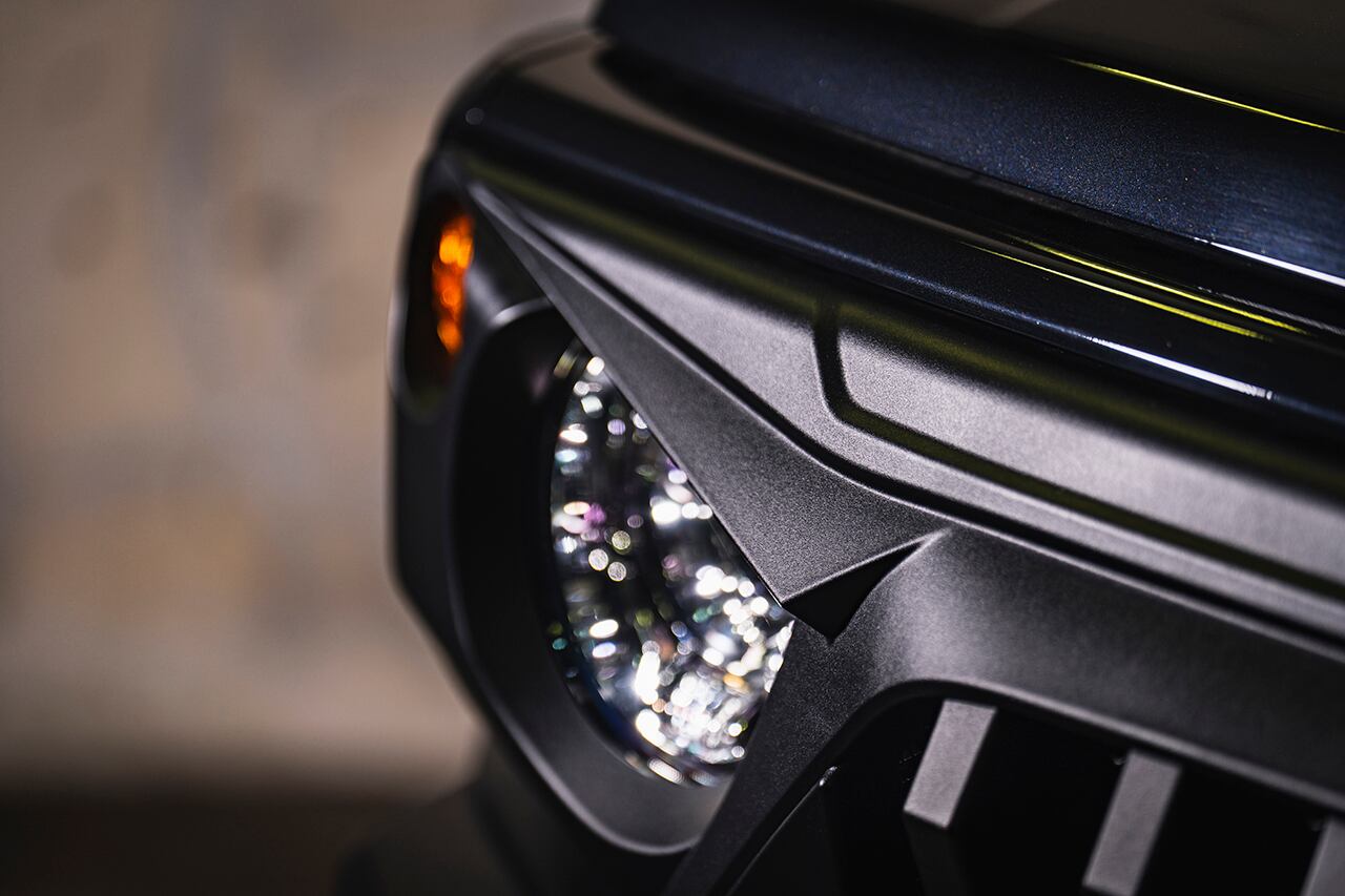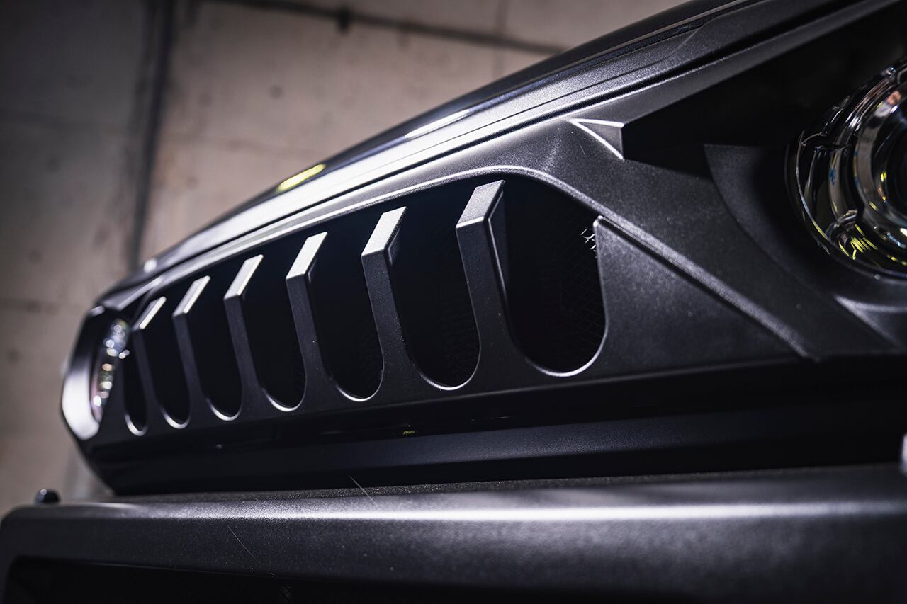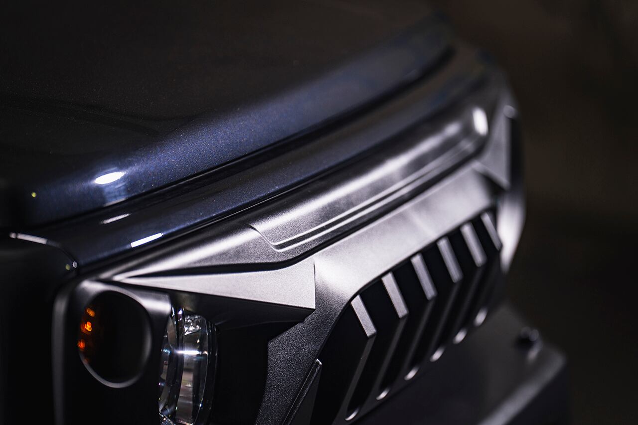 ラングラーなどUSオフロードカスタムシーンで注目を集めている、アングリーフェイスデザインが最大の特徴。ヘッドライトの上部は睨みを効かせるように鋭い造形を加え、イカツさを強調。くの字型に折れ曲がったセンター部のフィンは限界まで前方に伸ばしてフィンの奥行きを稼ぎ、極上の立体感を追求しました。イカツさを際立たせるシボブラック塗装済み。