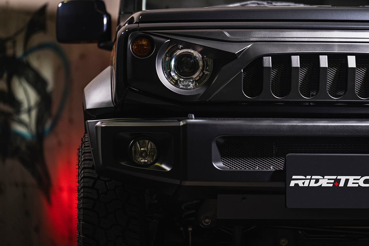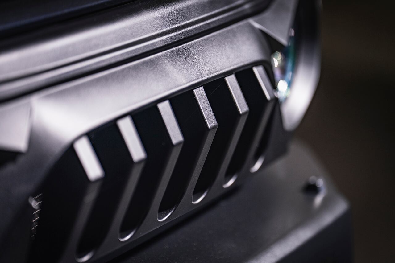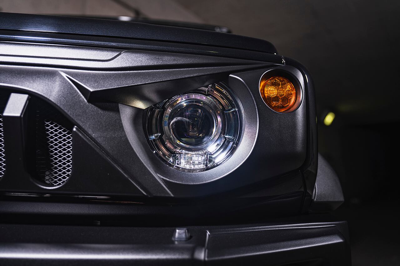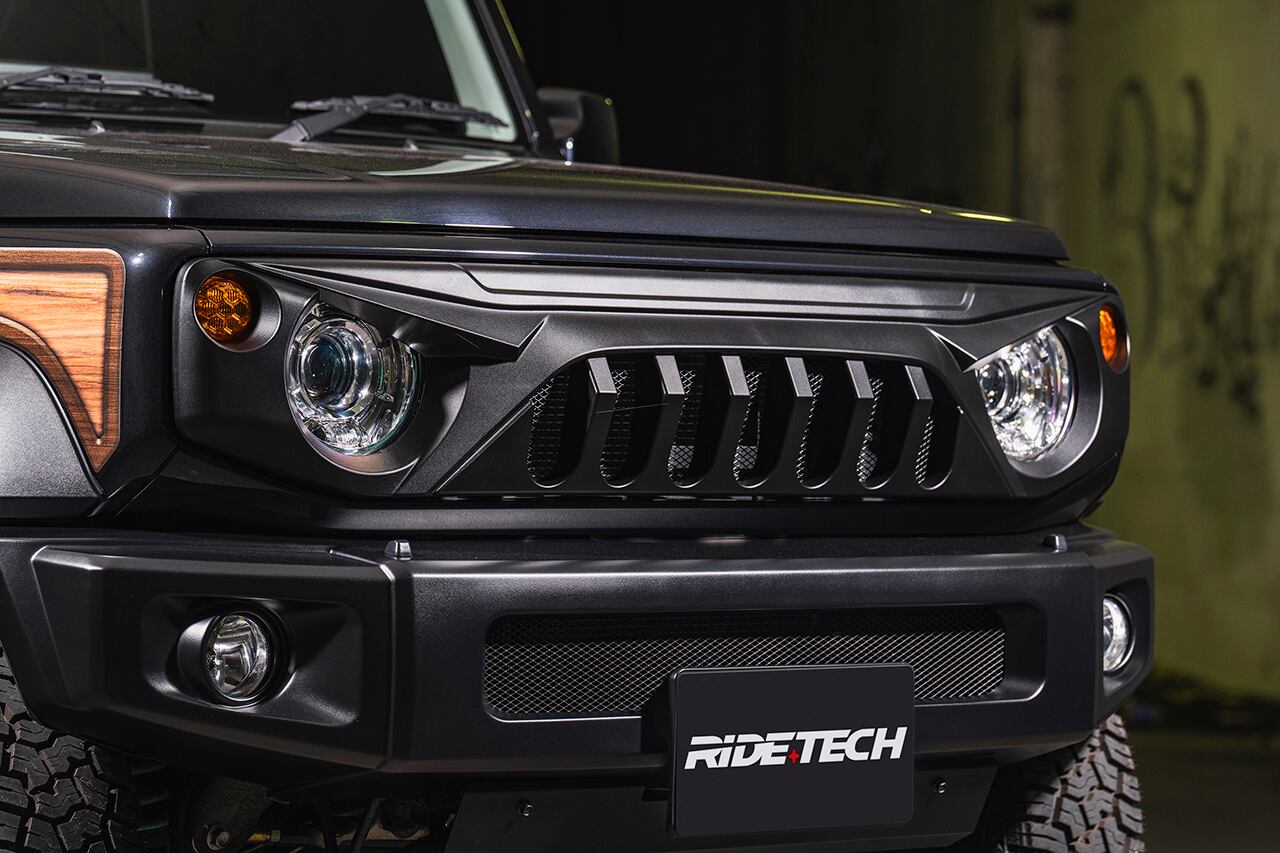 ラングラーなどUSオフロードカスタムシーンで注目を集めている、アングリーフェイスデザインが最大の特徴。ヘッドライトの上部は睨みを効かせるように鋭い造形を加え、イカツさを強調。くの字型に折れ曲がったセンター部のフィンは限界まで前方に伸ばしてフィンの奥行きを稼ぎ、極上の立体感を追求しました。イカツさを際立たせるシボブラック塗装済み。