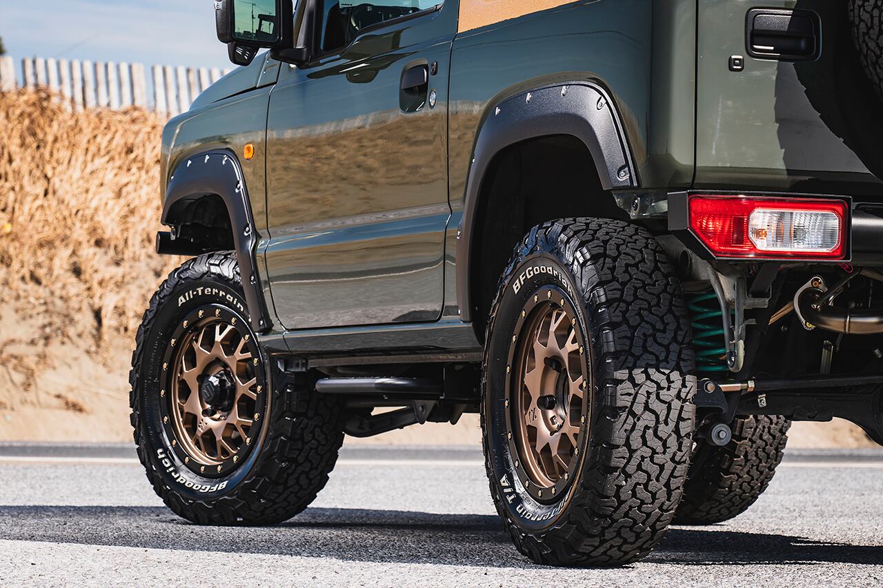JB64ジムニー専用オーバーフェンダー 取り付けるだけでワイルドな雰囲気になります。 ダミーリベットが付属しております。 取り付けは付属の両面テープとタッピングビスで止めてください。 素材:AES製 適合車種:JB64W ジムニー